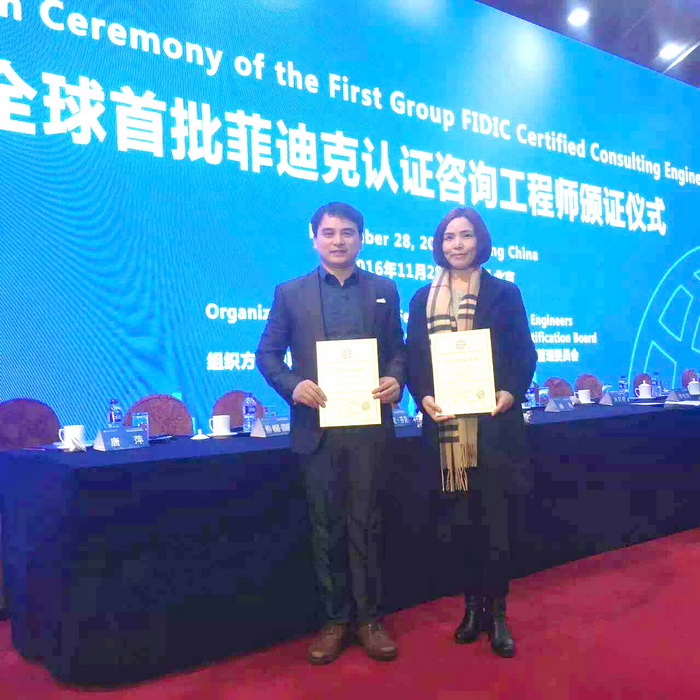 11月28日,由國際咨詢工程師聯合會(FIDIC、菲迪克)與中國工程咨詢協會聯合舉行的“全球首批菲迪克認證咨詢工程師頒證儀式”在北京舉行。中心副總經理肖艷菊、生態規劃處處長劉昭成分別通過對菲迪克課程的系統學習,順利通過考試,成為全球首批菲迪克認證咨詢工程師。擁有菲迪克認證咨詢工程師,意味著中心已具有國際視野、熟悉國際規則和慣例的高端技術人才,將為中心開展國際化咨詢業務提供更加強大的技術支撐。