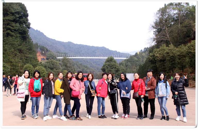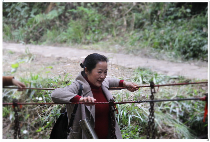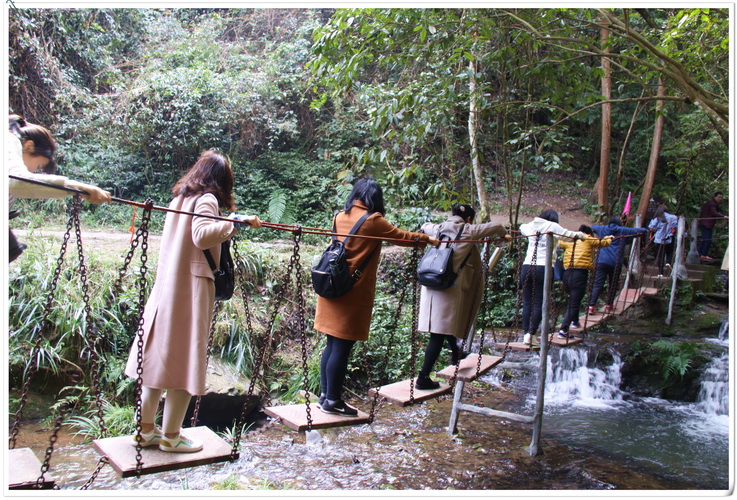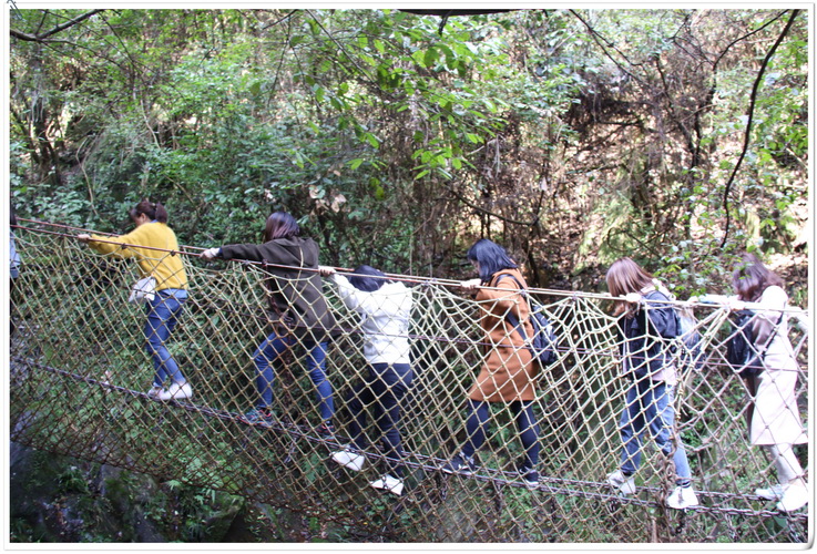 本次春游第一站為皇龍大峽谷。峽谷內,綠樹成蔭,溪水潺潺,入眼滿是原生態植被山林。沿著山路,景區內精心設計的浮動梅花樁、鐵索橋、壁虎網等道路并沒有困住湘咨姑娘們向上的腳步。大家不懼挑戰之險,不畏攀登之苦,努力跨越沿途障礙,收獲了諸多樂趣。