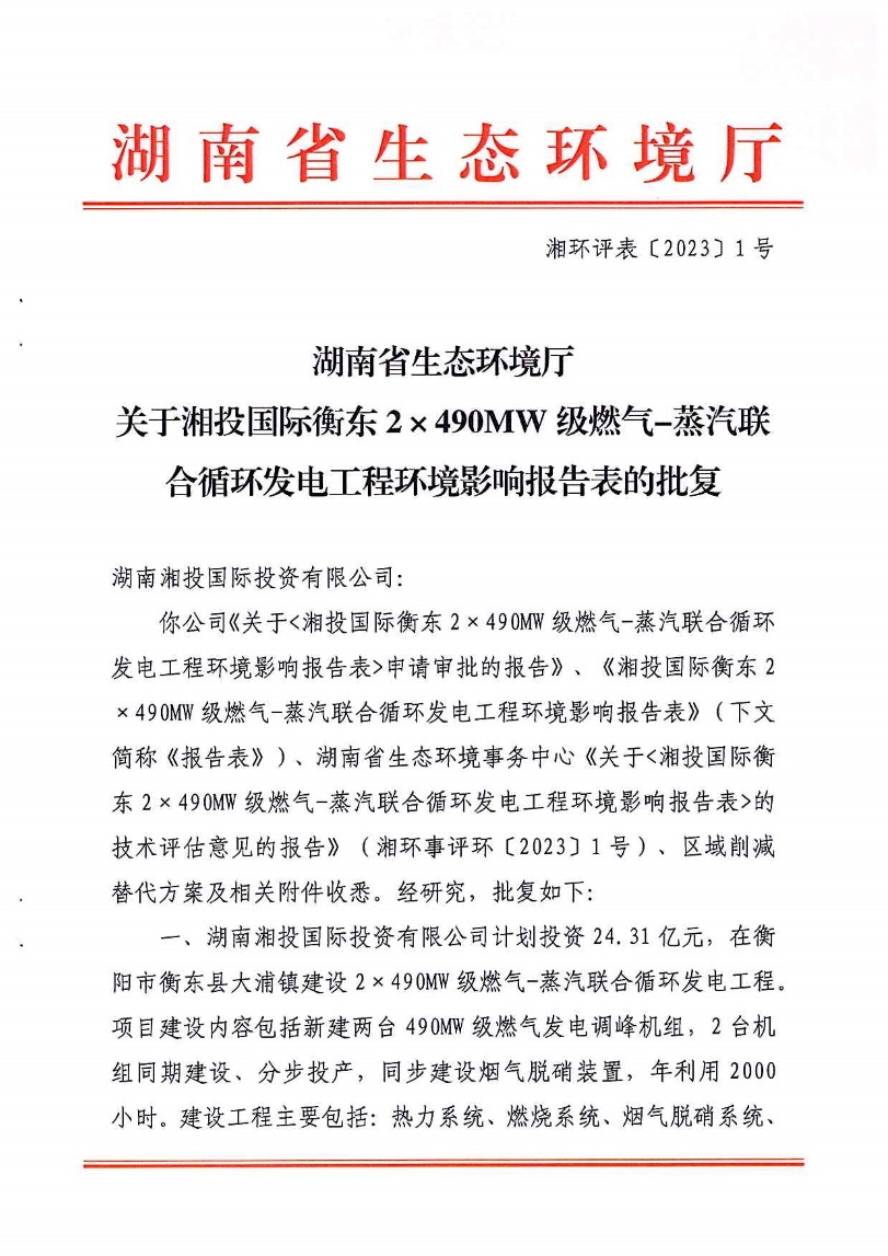 2023年3月9日,由省咨詢(xún)公司編制的《湘投國(guó)際衡東2×490MW級(jí)燃?xì)?蒸汽聯(lián)合循環(huán)發(fā)電工程環(huán)境影響報(bào)告表》順利獲得湖南省生態(tài)環(huán)境廳批復(fù)(湘環(huán)評(píng)表[2023]1號(hào)),為項(xiàng)目后續(xù)依法合規(guī)開(kāi)工建設(shè)奠定了堅(jiān)實(shí)基礎(chǔ)。