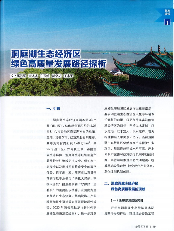 近年來,湘、鄂兩省在洞庭湖生態(tài)經(jīng)濟(jì)區(qū)生態(tài)修復(fù)、基礎(chǔ)設(shè)施、產(chǎn)業(yè)轉(zhuǎn)型和民生福祉等方面取得階段性成效。2023年2月國務(wù)院批復(fù)《新時(shí)代洞庭湖生態(tài)經(jīng)濟(jì)區(qū)規(guī)劃》,進(jìn)一步對(duì)洞庭湖生態(tài)經(jīng)濟(jì)區(qū)發(fā)展作出重要指示。然而,當(dāng)前洞庭湖生態(tài)經(jīng)濟(jì)區(qū)仍然存在生態(tài)保護(hù)任務(wù)艱巨,基礎(chǔ)設(shè)施建設(shè)水平不高,產(chǎn)業(yè)體系不完善和政策執(zhí)行機(jī)制不暢的問題。本文在精準(zhǔn)分析洞庭湖生態(tài)經(jīng)濟(jì)區(qū)發(fā)展困境的基礎(chǔ)上,從生態(tài)文明、基礎(chǔ)設(shè)施、產(chǎn)業(yè)發(fā)展、政策保障等方面探析洞庭湖生態(tài)經(jīng)濟(jì)區(qū)綠色高質(zhì)量發(fā)展路徑。