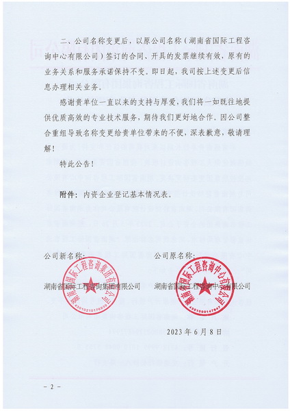 二、公司名稱變更后,以原公司名稱(湖南省國際工程咨詢中心有限公司)簽訂的合同、開具的發(fā)票繼續(xù)有效,原有的業(yè)務(wù)關(guān)系和服務(wù)承諾保持不變。即日起,我司按上述變更后信息辦理相關(guān)業(yè)務(wù)。