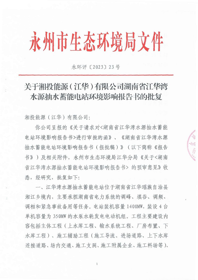 近日,我司環(huán)境保護咨詢事業(yè)部負責(zé)撰寫的《湖南省江華灣水源抽水蓄能電站環(huán)境影響報告書》,順利通過了永州市生態(tài)環(huán)境局的評審并取得批復(fù)(永環(huán)評〔2023〕23號)。