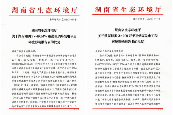 近日,由湘咨集團環境保護咨詢事業部編制的《陜煤汨羅2×100萬千瓦燃煤發電工程環境影響報告書》《湖南湘陰2×490MW級燃機調峰發電項目環境影響報告表》先后順利取得湖南省生態環境廳批復(湘環許決字[2024]417號、湘環許決字[2024]461號)。