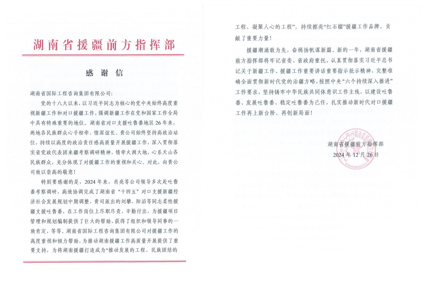 近日,湖南省援疆前方指揮部發來感謝信,對湘咨集團及副總經理肖亮、工作人員劉攀、陽滔等同志在援疆工作中作出的貢獻表示感謝。 近年來,湘咨集團積極響應黨中央關于援疆······